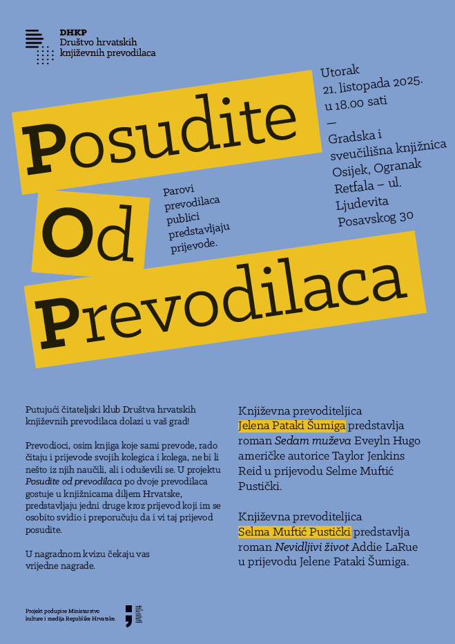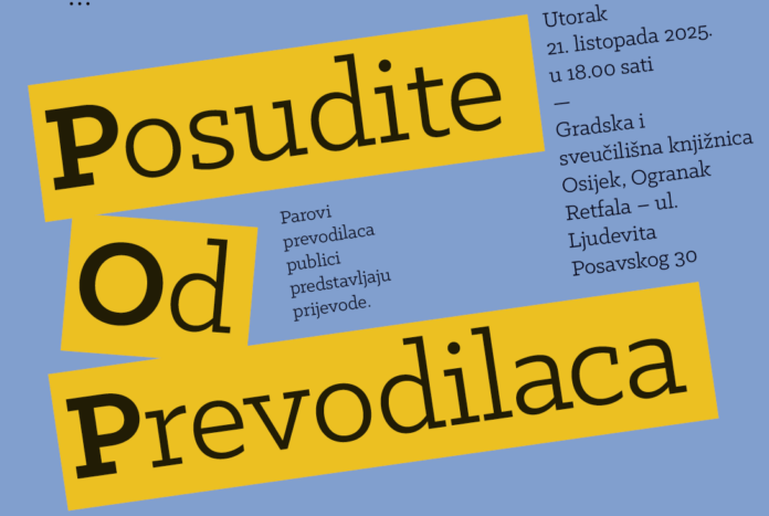 American Corner Gradske i sveučilišne knjižnice Osijek organizira književnu večer pod nazivom “Posudite od prevodilaca”, koja će se održati u utorak, 21. listopada 2025. s početkom u 18.00 sati u prostoru Ogranka Retfala (Ljudevita Posavskog 30).