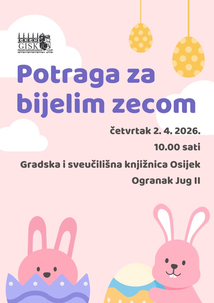 U povodu uskrsnih praznika, Gradska i sveučilišna knjižnica Osijek organizira igru za djecu pod nazivom “Potraga za bijelim zecom”. Potraga će se održati u četvrtak, 2. travnja 2026., s početkom u 10.00 sati, u Ogranku Jug ll Gradske i sveučilišne knjižnice Osijek (Opatijska 26f Osijek).