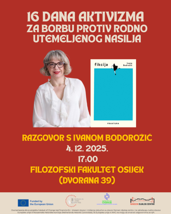 Nansen dijalog centar, Gradska i sveučilišna knjižnica Osijek i Filozofski fakultet Osijek, u okviru kampanje 16 dana aktivizma za borbu protiv rodno utemeljenog nasilja, organiziraju razgovor s književnicom Ivanom Bodrožić i predstavljanje knjige pod nazivom “Fikcija”. Susret će se održati u četvrtak, 4. prosinca 2025. s početkom u 17.00 sati, u dvorani 39 Filozofskog fakulteta Osijek. Program će moderirati urednica Glasa Slavonije Ivana Rab Guljaš.