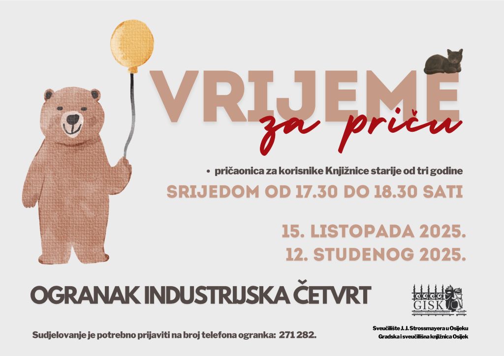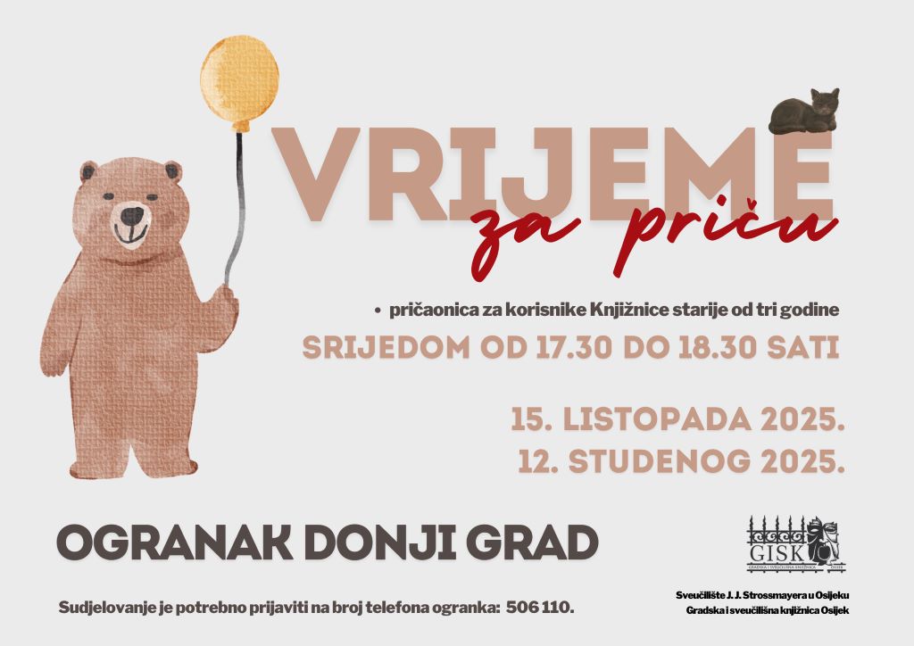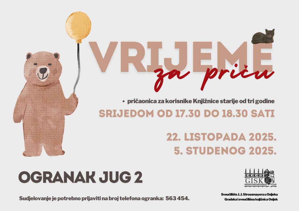 Tijekom Mjeseca hrvatske knjige, srijedom u vremenu od 17.30 do 18.30 sati u ograncima Gradske i sveučilišne knjižnice Osijek, održavat će se Vrijeme za priču, pričaonice za korisnike Knjižnice starije od tri godine. Detaljan raspored pričaonica nalazi se u nastavku: