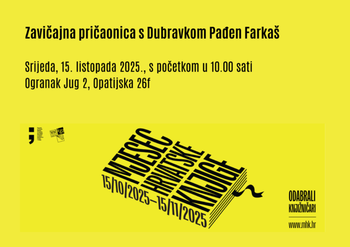 U povodu obilježavanja Mjeseca hrvatske knjige 2025., Gradska i sveučilišna knjižnica Osijek, u srijedu, 15. listopada 2025., s početkom u 10.00 sati, u prostoru Ogranka Jug II organizira Zavičajnu pričaonicu s Dubravkom Pađen Farkaš. Zavičajna pričaonica Gradske i sveučilišne knjižnice Osijek, ciklus je književnih susreta za djecu i mlade nastao s ciljem poticanja čitanja i razvijanja ljubavi prema knjizi te stvaranju navike dolaženja u knjižnicu.